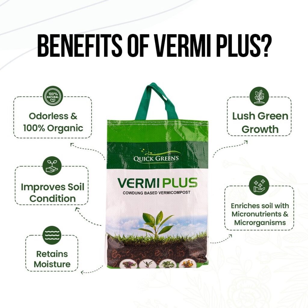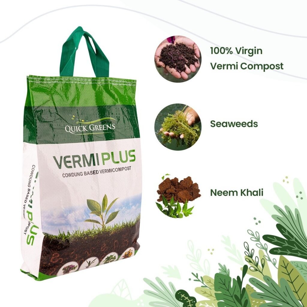 Quick Green Vermi Compost is the perfect choice for gardeners and farmers who prioritize organic and sustainable gardening practices. Its rich nutrient composition, convenient storage, and easy application make it an ideal fertilizer for achieving vibrant and healthy plants. Order your Vermi Compost bag today and experience the benefits of this premium Vermi Plus fertilizer for your plants’ optimal growth and nutrition.